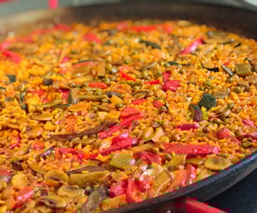Arroz con calabacín, berenjena, pimiento rojo, judía verde, garrofón, champiñón y tomate.