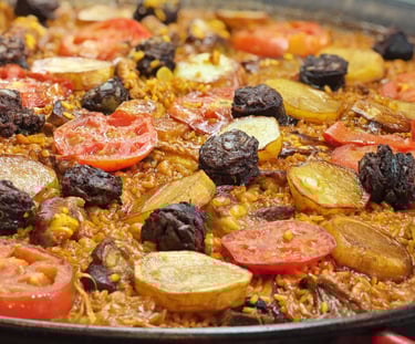 Arroz con costilla de cerdo, bacon,morcilla, garbanzos, patata y tomate.