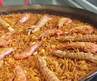 Fideo de trigo con sepia, langostinos, tomate y caldo de pescado.