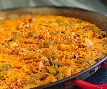 Arroz con pollo, carrillada de cerdo, pimiento rojo, guisante y tomate.